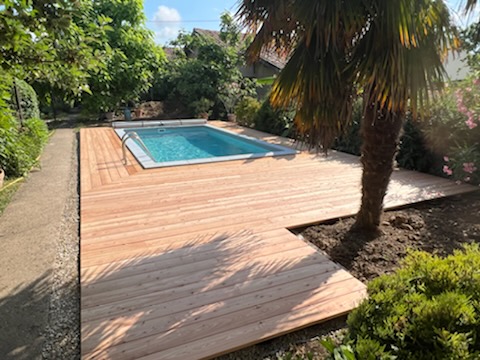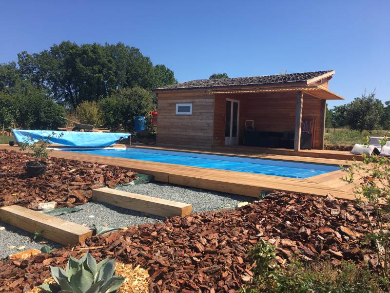 TERRASSES MELEZE BOMBEE ET POOL HOUSE BARDAGE MELEZE ET TUILE MELEZE